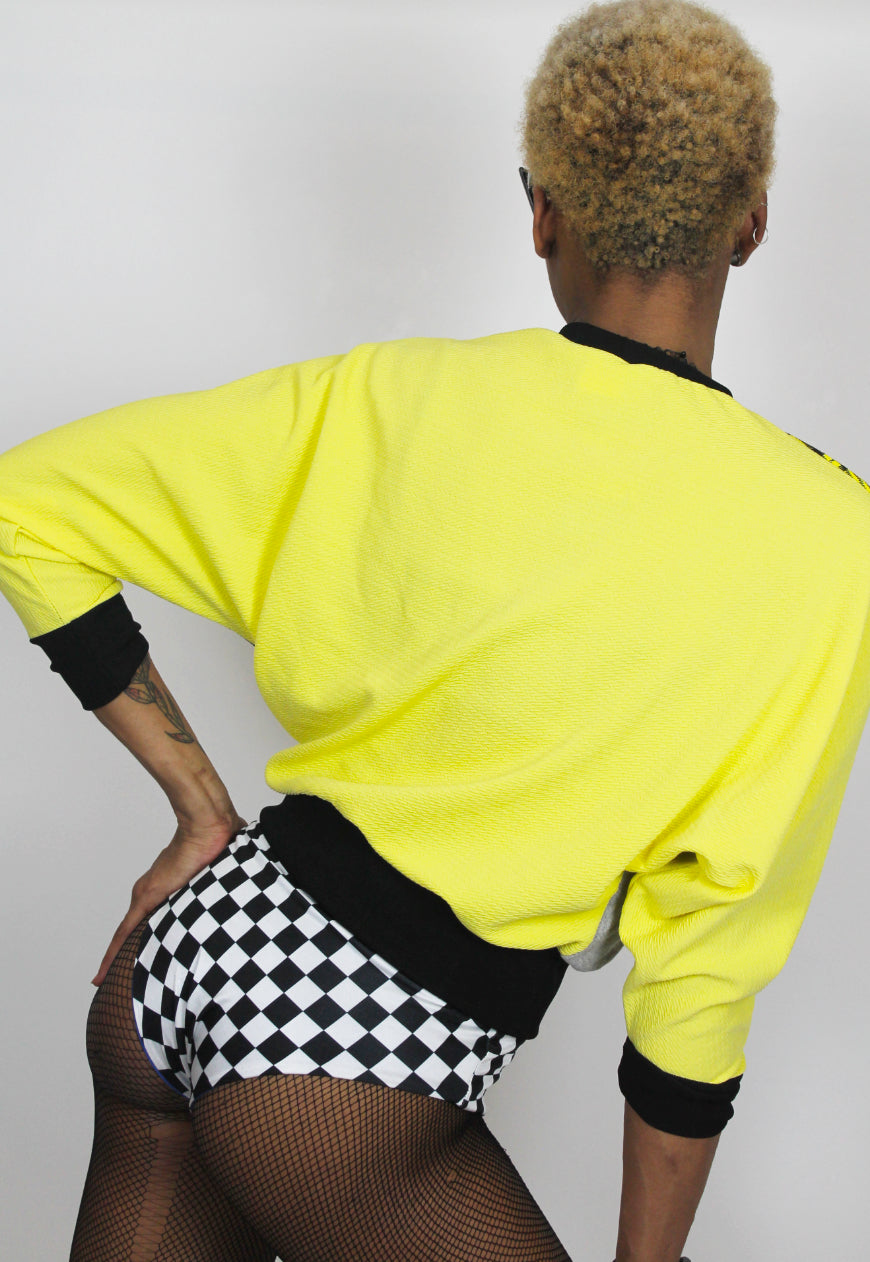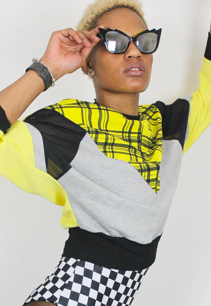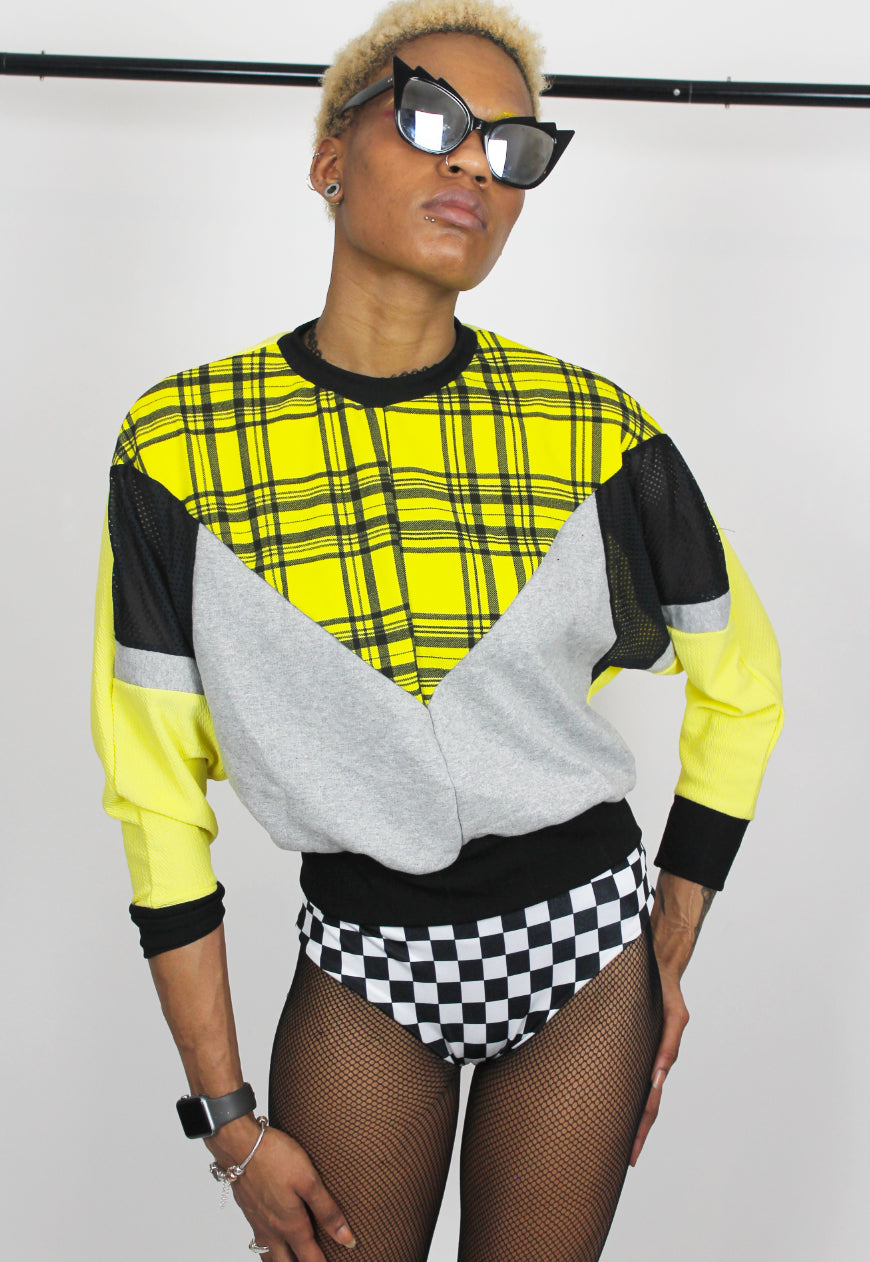 Relaxed 80s batwing aesthetic this yellow, colorblock sweater consists of black and grey accents and is finished with an 90’s style check printed panel
