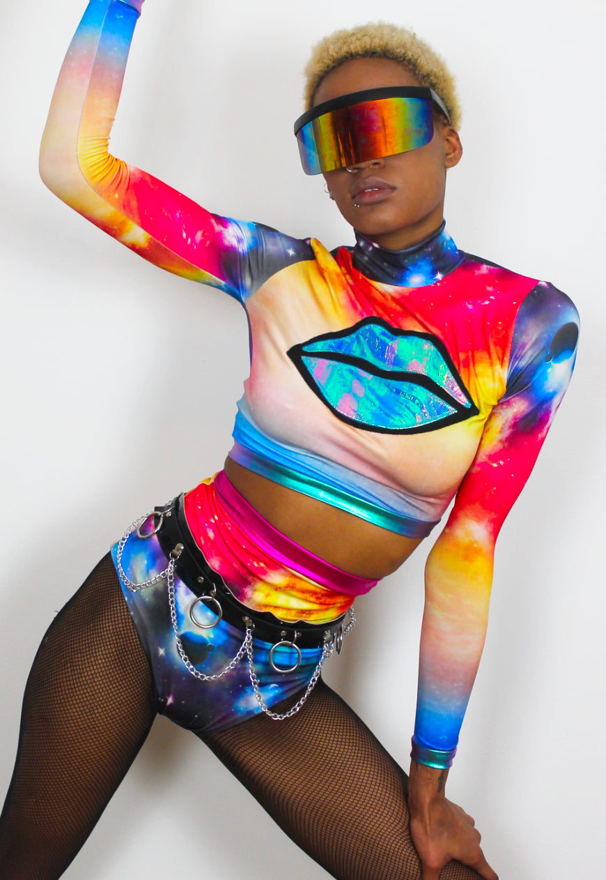 Galactic Kisses - long sleeve cosmic print crop top with iridescent lips.