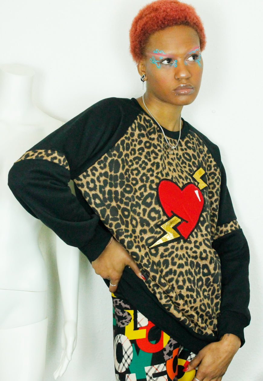 LOVE HURTS Leopard and black oversize sweater with large heart and lightning bolts