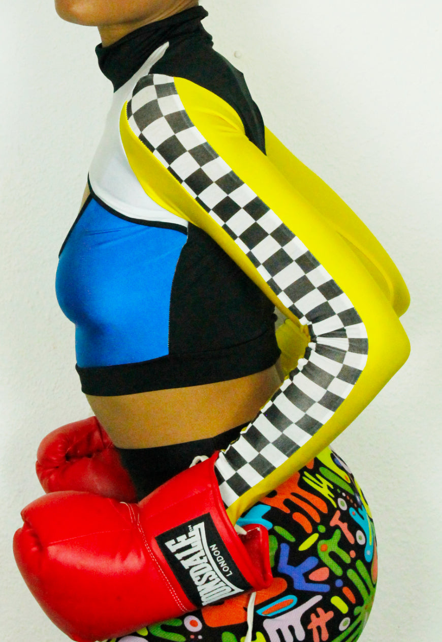 And the category is, Show stopper. Start your engines and take centre stage in this stunning long sleeve crop top with peekaboo front panel. Yellow and blue colourblock panels paired with checkerboard sleeve panels will make sure all eyes are on you in this versatile top of dreams. Go full on leroy and clash with Wildchild crazy print leggings or alternatively dress up with vegan leather pants or high waisted flares or go relaxed glam with 90s mom jean.